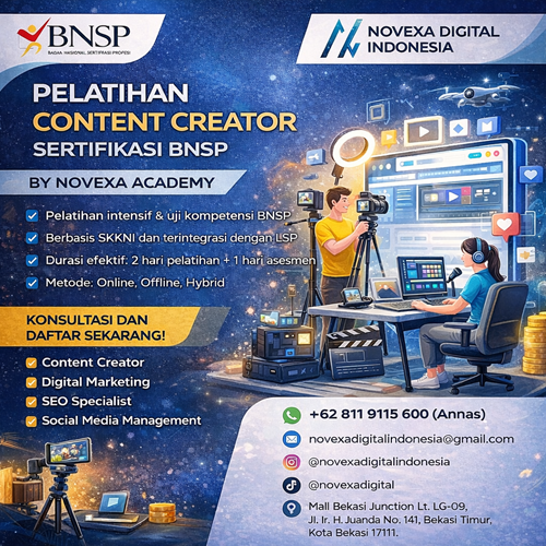 Banyak Content Creator Sudah Aktif Membuat Video Dan Konten Digital, Tetapi Belum Memahami Standar Kerja Yang Diakui Secara Nasional. Portofolio Ada, Namun Belum Tersusun Sesuai Unit Kompetensi. Saat Ingin Mengikuti Sertifikasi, Banyak Yang Bingung Menyiapkan Evidence Dan Memahami Alur Asesmen. Pelatihan Content Creator Sertifikasi BNSP Dari Novexa Academy Membantu Menjawab Kebutuhan Tersebut. Program Ini Menggabungkan Pelatihan Intensif Berbasis SKKNI Dan Uji Kompetensi BNSP Melalui LSP Mitra Resmi Agar Peserta Siap Secara Teknis Dan Administratif.